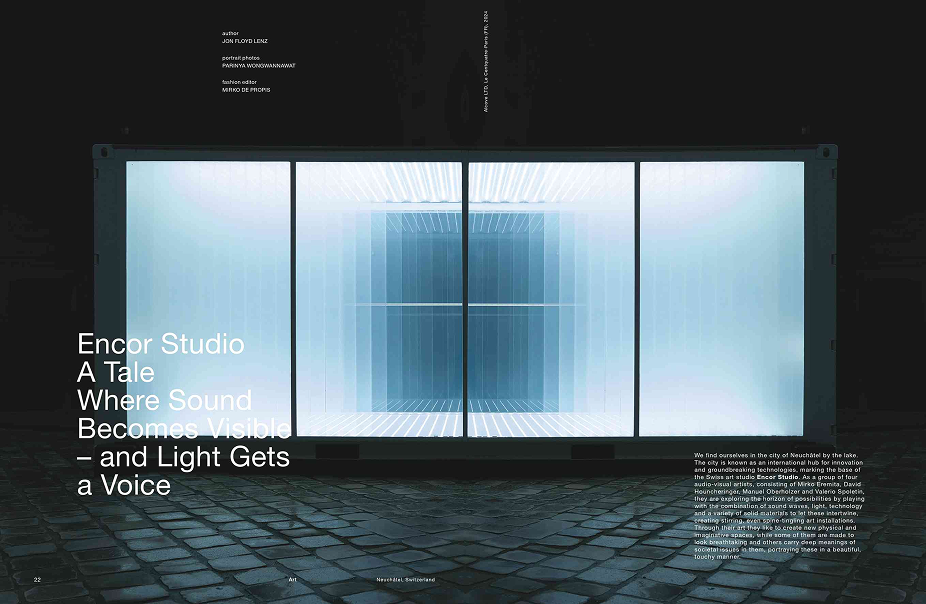 Encor Studio was founded in 2016 by Swiss audiovisual artists Mirko Eremita,David Houncheringer, Manuel Oberholzer and Valerio Spoletini. Their skillsand sensibilities shape the unique identity of the studio and its projects. Combining technology with lo-fi materials, using self-developed toolsand playing with scales, Encor Studio is on board a journey where beauty takes center stage. Underlining the symbolic value of light and sound, the artworks of the studio merge technology with the physicality of space. Theway hidden information is made palpable, interwoven in our physical and social lives, offers a fresh perspective on an ever-evolving world that, like the properties of light itself, remains mostly a mystery.